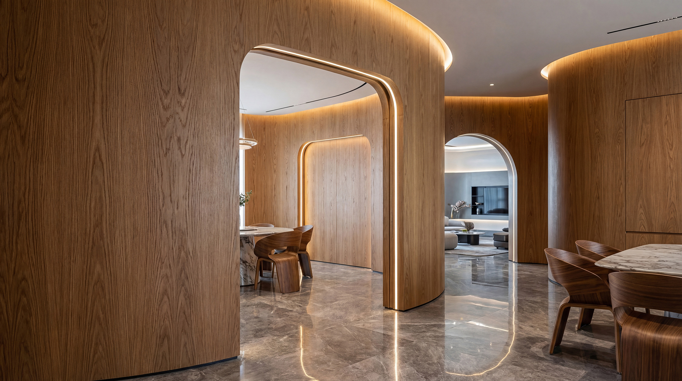 Арка подчёркивает центральность пространства и делает переход между зонами мягче и благороднее.